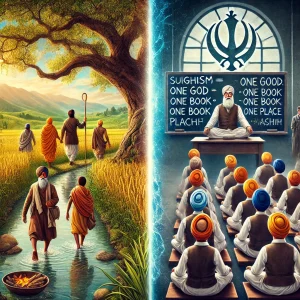 In this reframing, the ontological lifestyle was displaced. Guru Nanak’s emphasis on Being dissolved into belief; his rejection of ritual was replaced with ritualised “worship services.” Sangat was reframed as congregation (church model). Guru was recast as prophet, and Shabad as scripture.